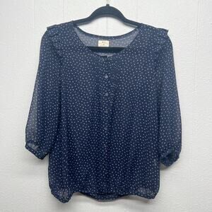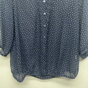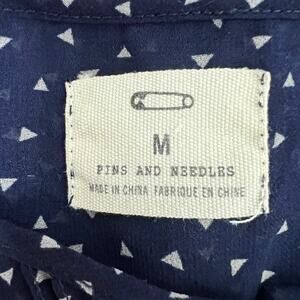 Pins & Needles women's triangle print sheer top in navy blue & white Round neck. Ruffle shoulders. Button down. 3/4 sleeves with elastic hem. Lightweight. Unlined. In good used condition. No stains, tears or holes.