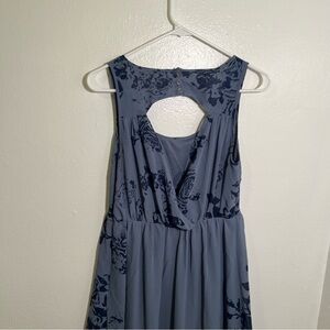 Great condition. Pins and Needles. Urban Outfitters. Babydoll dress. Blue gray color. Floral. Sleeveless. Scoop neck. Open back. Elevate your wardrobe with the elegant flow of this Pins & Needles chiffon dress in a stunning shade of blue. The hi-low silhouette paired with a round neckline and strappy sleeveless design captures a summer breeze feel, perfect for formal events, cocktail parties, or even a dreamy wedding backdrop. With its lightweight and lined fabric, comfort is assured without compromising on style. Delicate embroidered accents add a touch of grace to the shift dress, which is neatly finished with a zip closure. Size 4. 100% polyester. Pit to pit laying flat 17.5” shoulder to hem 35”/41”. All measurements are approximate and taken lying flat. Smoke free home. No trades, offers welcome.