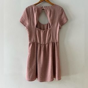 Gently used Pins and Needles dress, women’s size Large. Light pink with textured patterns, floral texture on the bodice, open back, side zipper, with a lining. Polyester, not a lot of stretch. Some loose threads on the fabric and marker on the label, but otherwise no known flaws, please see pics for details and flat lay measurements. Truest color in pics with white background and close up pics. Smoke and pet free home, fast shipping. Thanks!