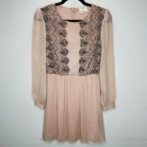 Pins and Needles Rose Tyrie and Black Lace Long Sleeve Lined Gauze Mini Dress 0