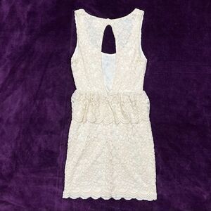 Super cute pre-owned Pins and Needles from Urban Outfitters ivory cream peplum dress, size XS. Has some stretch to it. Great for a vintage look or bridal shower! Open back. Zips up the side. No stains or holes. Please ask all questions before purchasing.