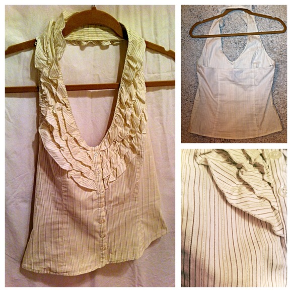 Off-white stretch fitted halter-style sleeveless tuxedo blouse. Brown and gold pin-stripes (the gold thread has some subtle shimmer). Ruffle detail and buttons on front. Ribbing/darting detail on all sides. Great/new condition, only worn one time. 39% Nylon, 54% Cotton, 6% Spandex, 1% Polyester. Machine wash cold, tumble dry low.