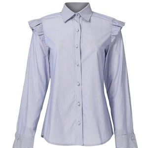 A fun, structured shirt with added flare at the shoulders. Chic ruffles accent the shoulders of this playful blue and white pinstripe Harvey Faircloth collared shirt. Perfect career / work shirt.