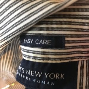 Pinstriped. Great with a skirt or suit. V neck as buttons don’t go all the way up front.
