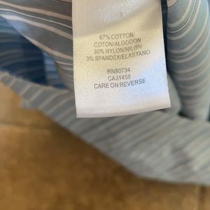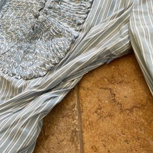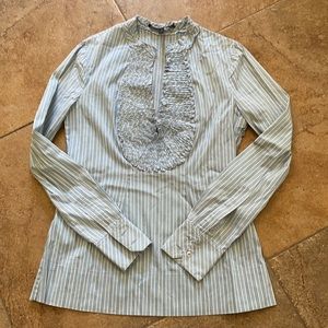 Zips on the side. Soft and stretchy fabric. Looks finished if worn out with slacks or leggings. Can also be tucked in to suiting or skirt. Beautiful detail across chest