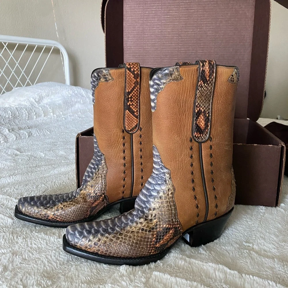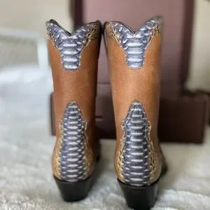 These one of a kind cowgirl boots feature a tri-color python design that are made to stand out! The python skin has a shade of blue, grey, and black. You can rock these every season. Made out of genuine calf skin and python.