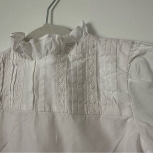 This pure cotton top featuring crochet and pintuck details, pretty puff sleeves and a high ruffle collar. It's the perfect addition to any look.