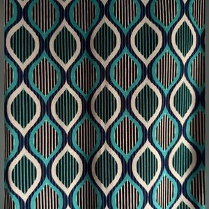 Belted sheath dress in excellent condition. Gorgeous and trendy mid-century modern print and teal and turquoise. Hidden side zip. Pin-tucked seams at the waist, provide tailored shaping for a clean silhouette.
