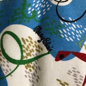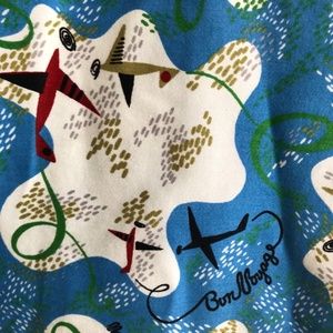 This blue skirt features a whimsical print of airplanes. The text "Bon Voyage" and "Mary Blair" alternate around the print. It's perfect for a Disney Dapper Day, or summertime picnic!