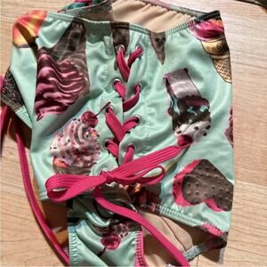 This Pinup Couture bikini is perfect for anyone who loves a retro style. The high-waisted mint green bottoms feature adorable ice cream cone prints that will make you feel like you're on vacation. The halter top has a lace-up design, adding a touch of femininity to the overall look.