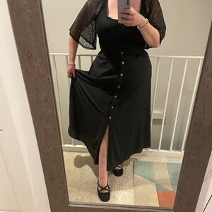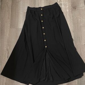 This elegant 1940’s style maxi skirt by Pinup Couture features a flowing A-line silhouette with a stylish slit, perfect for casual or work settings. The skirt has an elastic stretch waist for comfort and is lined. The maxi skirt has gold colored buttons down the front. The gold color buttons adds a touch of sophistication, while the full length offers a graceful drape.