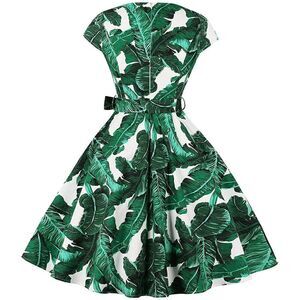 🌴 Women's Pinup Retro Vintage 1950s 60s Swing Summer Cap Sleeve Cocktail Rockabilly Green Palm Leaves Print Dress