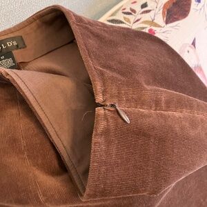 Pair of chocolate brown pinwale corduroy pants with wider leg in Size 12, designed by Harold's. Pant legs are embellished with interesting red, denim blue, and cream embroidery in a floral pattern that winds down the leg and shows partially from the back. There is a hidden zipper in the side, no waistband, so very neat with tucked in blouse or sweater.