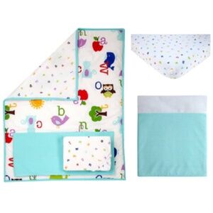Snuggle in for sweet alphabet dreams with wonderful friends like a wise owl, curious cat, and smiling sunshine! The Pinwheel Alphabet Play Crib Bedding Set includes a reversible comforter, fitted crib sheet and bonus dust ruffle. The Alphabet Play set features a reversible comforter with bold letters and their matching characters on one side, and a colorful allover letter print on the reverse, an allover print fitted crib sheet, and a solid bonus aqua dust ruffle. Coordinates with the Pinwheel Alphabet Dreams nursery decor and blankets.