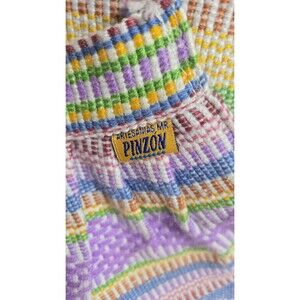 The Pinzon Mexico Woven Multicolor Boho Hippie Purse is a unique and stylish accessory for women, featuring a square shape with a colorful striped pattern. This medium-sized shoulder bag is perfect for casual or travel occasions, with a zip closure and multicolor cotton double handles adding a bohemian touch to any outfit. The exterior is made of canvas, with multiple pockets for added functionality, and the interior is lined with multicolor fabric. Made in Mexico by the brand Pinzon, this hippie-inspired purse combines vintage charm with a colorful and trendy design.