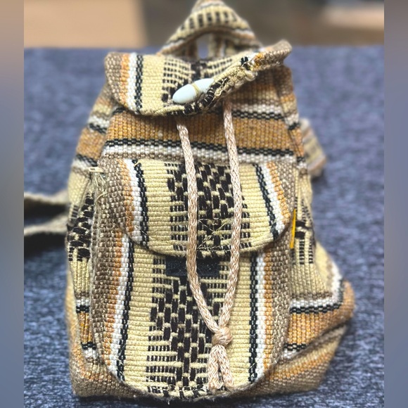 Artesanias Mr. Pinzon Drawstring Boho Hippie Rasta mini bag, woven Southwestern Mexican blanket/sarape material. Clean, like-new, slight blue streak inside front pocket (see pics).