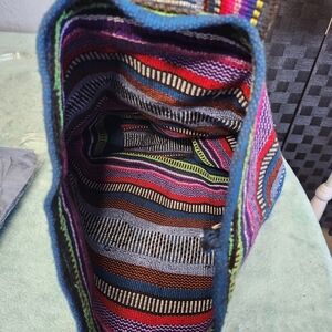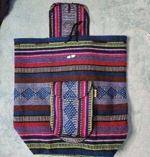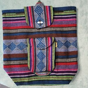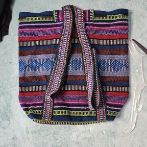 This vibrant multicolor striped backpack is a stylish choice for any outing. Its bold design features a mix of blue, pink, and green, making it a standout accessory.