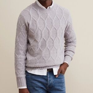 Elegant dark blue sweater with intricate cable knit design. Ideal for layering.