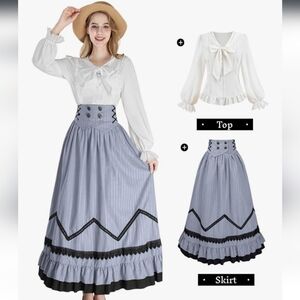 FEATURES:The white edwardian blouses has a fixed bow tie at the neckline, puffed long sleeves with ruffled lace cuffs and classic button-up design, allowing for easy wear. The grey blue victorian skirt has high waist, decorative metal button, black lace strips on the bottom, side zipper for easy wear.