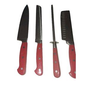 Bring rustic charm and practical style to your kitchen with this Pioneer Woman 8-piece knife set featuring vibrant red triple-riveted handles and stainless steel blades. This discontinued set is perfect for collectors or anyone who loves the farmhouse aesthetic of Ree Drummond’s cookware line.