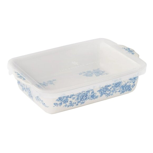 Add a touch of vintage-inspired charm to your kitchen with The Pioneer Woman Agatha Small Rectangular Baking dish with Polypropylene Lid. This 7" x 11" ceramic baker features Ree Drummond’s signature floral design and scalloped edges, perfect for oven-to-table serving. The included polypropylene lid offers convenient storage and transport options. The stoneware casserole type baker is oven safe up to 400°F and dishwasher safe, while the lid is microwave and dishwasher safe (not oven safe), making this set ideal for everyday use and special occasions alike.
