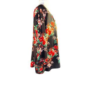 Chic black tunic featuring vibrant red floral design. Ideal for casual outings or dressed up for special occasions. Comfortable fit for medium size women.