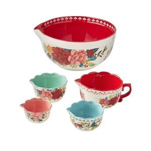 Cheerful Rose,5 piece mixing & measuring set, by Pioneer Woman. Beautiful set will brighten your kitchen, and raise your spirits while using. You will want them to set out. set contains BEAUTIFUL Batter Bowl and 4 measuring cups. I can't hide mine in the cupboard. Smoke free pet loving home 💗. Unable to bundle due to weight