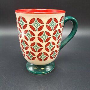 The Pioneer Woman Christmas Footed Mug is crafted from durable stoneware, featuring a festive red and green mod geometric design. Holds 15.5 oz.