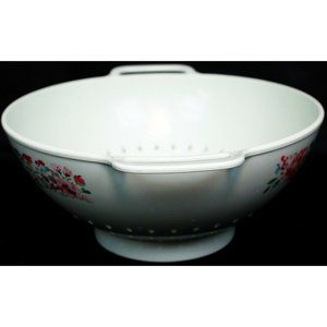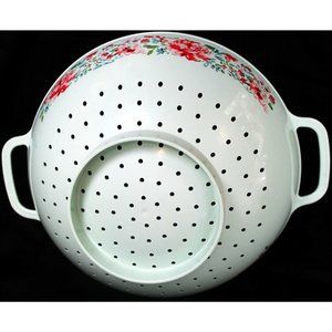The strainer/colander has a rectangular stripe on each side of red/ pink flowers and blue/ green floral accents.