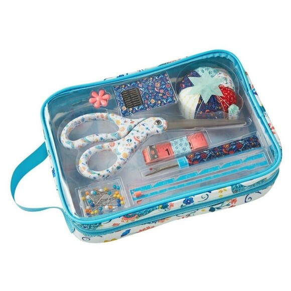 This Pioneer Woman Mazie Sewing Kit Carrying Case is a 9-piece set including scissors, needles and a seam ripper.