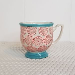 Make A Wish Mug. Brighten your kitchen with this charming Pioneer Woman cup! Features a red starburst pattern on a cream base with a teal blue rim and footed bottom. Perfect for your morning coffee, tea, or cocoa.