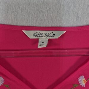 Pioneer Woman Shark Bite Hem Tunic in size XL is a pink peasant top with embroidered floral accents, perfect for various occasions such as travel, party, casual wear, and workwear. This lightweight blouse features a V-neckline, pullover closure, flared sleeves, and a relaxed fit. Made of polyester, it is easy to care for and machine washable. Ideal for all seasons, this tunic embodies the Pioneer Woman character with its colorful and classic theme, making it a versatile addition to any wardrobe. NWT
