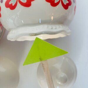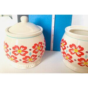 Pioneer Woman sugar bowl with lid red 4.5" flowers blue belly round retro, Nobbled around the bottom, Lid included, Some wear on the bottom, "From my Frontier to yours" Beautiful, Quality Dinnerware, Dishwasher safe. No rips, holes, stains or noticeable flaws.