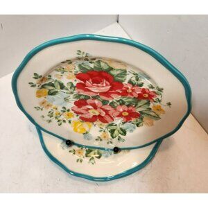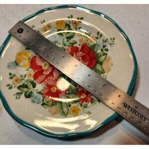 The Pioneer Woman Vintage Floral Turquoise Edge Salad Plates are a set of three 8.5 inch round stoneware plates featuring a country-style design with a floral pattern. The plates have a shiny finish, are microwave and dishwasher safe, and are suitable for all occasions. With a teal trim accent, these original plates are perfect for serving salads or desserts in a garden-themed or floral-inspired setting, adding a touch of charm to any dining table. Made by Pioneer Woman, these plates are a beautiful addition to any kitchen or dining collection. Pre-owned by collector. In good condition with no chips or cracks. Please see pictures for details.