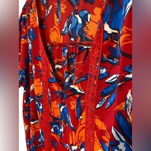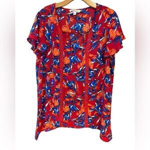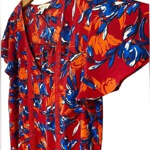 Pioneer Woman Sz L Red Blue Large Flowers Square Neckline Flowy Relaxed Fit Top