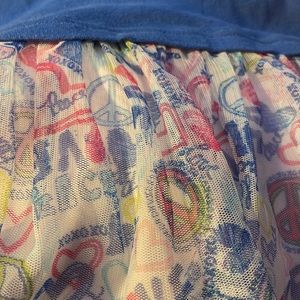 Piper Girls Razorback Blue Heart Graphic Dress with Net Skirt and Peace Graphics. There is a small bit of ink on the under lining.
