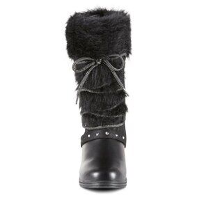 Every step has a stylish touch in these Rachaela girls' Piper & Blue fashion boots. Starting with a faux fur collar and finishing with a low wedge heel, these cute casual boots look toasty and trendy. Heart-shaped quilting and laces decorate the shaft along with jewels and pops of glitter.