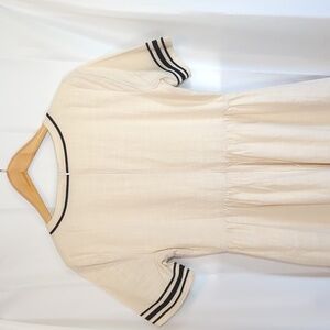 Piper and Scoot dress, cream mini dress, retro mod dress, striped trim dress, short sleeve mini, neutral casual dress, Aniston dress Piper & Scoot, everyday summer dress, fit and flare casual dress