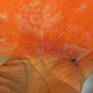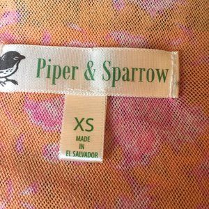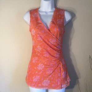 Piper & Sparrow raw hem, apricot orange color with pink flowers raw hem multiple layer mesh, faux wrap asymmetrical top, sleeveless, stretch. See all images for detail and condition, Excellent used condition, no flaws found. See images for measurements.