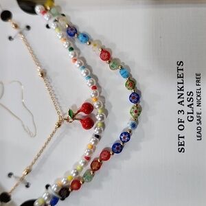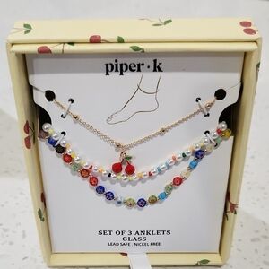 🍒 🔹️Piper k 🔹️Red Cherry and Blue Beaded Set Of 3 Glass Anklets ✨️🍒