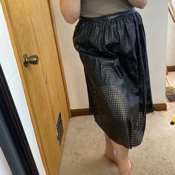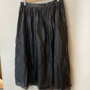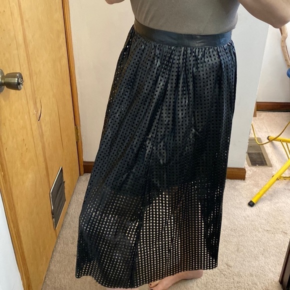 Piperlime Black vegan leather laser cut full midi skirt with lining. Side zip. Flat waistband. Edgy and chic. Rare! Like new condition. (L)