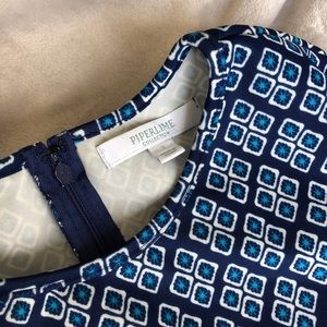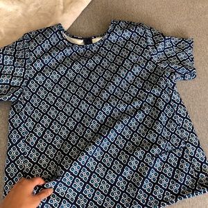 Top with a diamond shape repeated pattern by Piperlime Collection. Short sleeves. Has two real front pockets! Navy and light blue color. Size small. Zipper and hook closure.