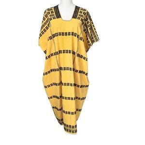 Pippa Holt Kaftan No.171 Three Panel Maxi Kaftan in Yellow Black. One Size. Features: short sleeves, a relaxed silhouette and fit, front pockets and contrast black embroidery. The symbols on this Pippa Holt piece represent joy, union and family. 100% cotton. Great pre-owned condition, no notable flaws. Retails $1,704.