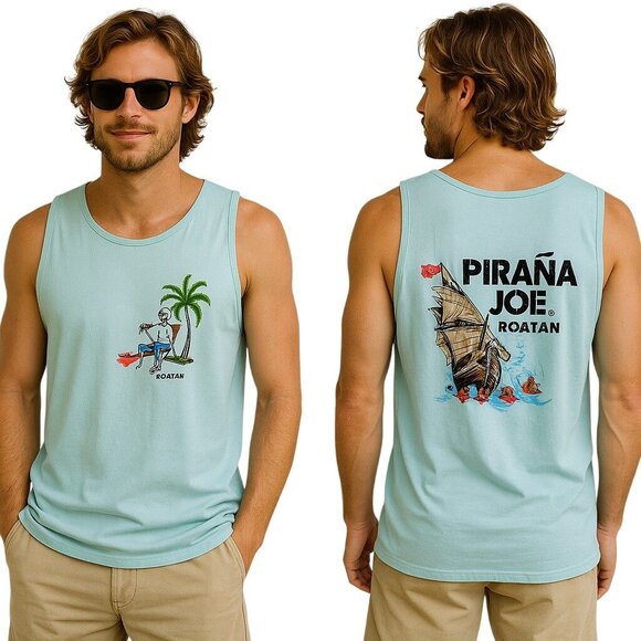 Casual and fun Pirana Joe Roatan sleeveless cotton tank top in light blue. Features a small front chest graphic of a skeleton pirate on a beach, and a large bold graphic of a pirate ship and red pirahanas and distressed text on the back.