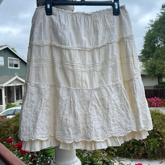 Feat. pointelle layered skirt; floral cutouts and textured fabric; inner skirt with gauze fabric edges; very low rise