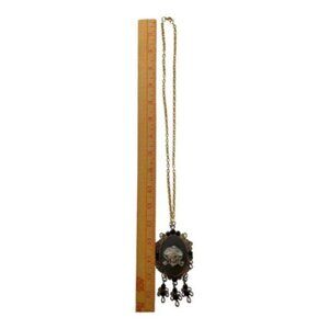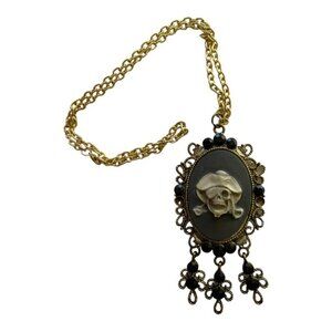 Pirate skull cameo with gold tone chain 16.5” drop. Preowned in good condition.