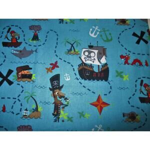 These wonderful place mats measure 13 1/2" x 10 1/2". One side is a chalkboard fabric that you can write on and then wipe it off just like a chalkboard there is an elastic holder to hold your piece of chalk.. The other side is blue with pirates and pirate ships. Fabric placement may vary.