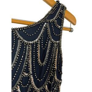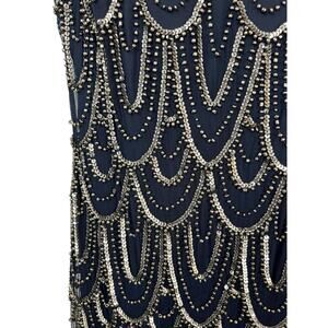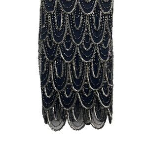 Elegant black midi dress with intricate silver beadwork. Sleeveless design. Perfect for evening events.