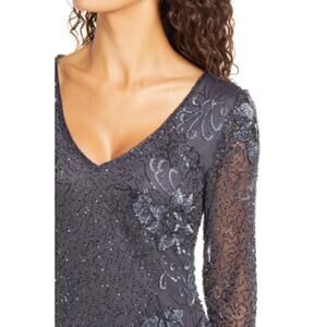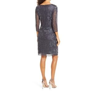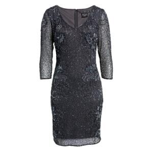 Pisarro Nights Dress 2 Gray Beaded V Neck 3/4 Sleeve Knee Length Cocktail Slate Sparkle Party Wedding Cocktail Formal Evening Bridesmaid Holiday Christmas Event