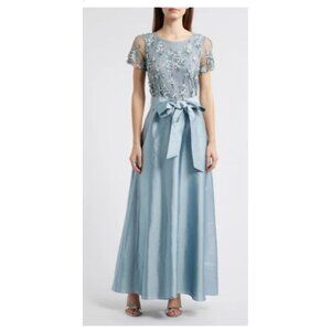 •Features: Beaded floral appliqué bodice, sheer mesh short sleeves, tie waist, maxi length skirt